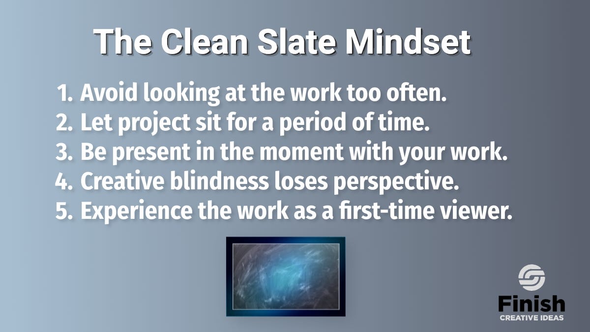 Create a schedule that enforces distance. Work on your project only on specific days, leaving gaps in between. These gaps are your creative reset buttons.